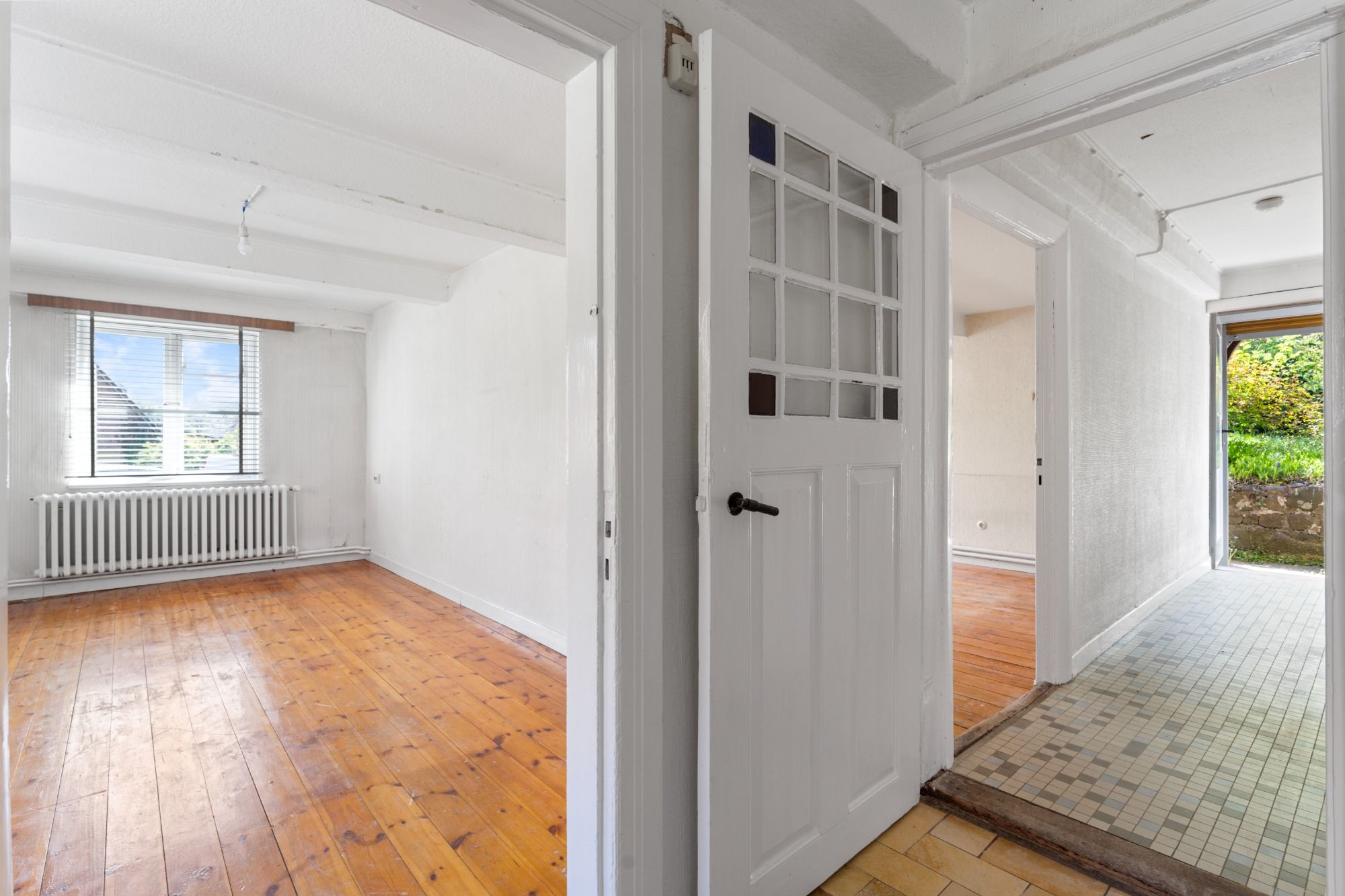 Man schaut in einen Flur und sieht links eine Treppe nach oben und geradeaus die lichtdurchflutete Veranda eines Hauses um die Größe zu ver