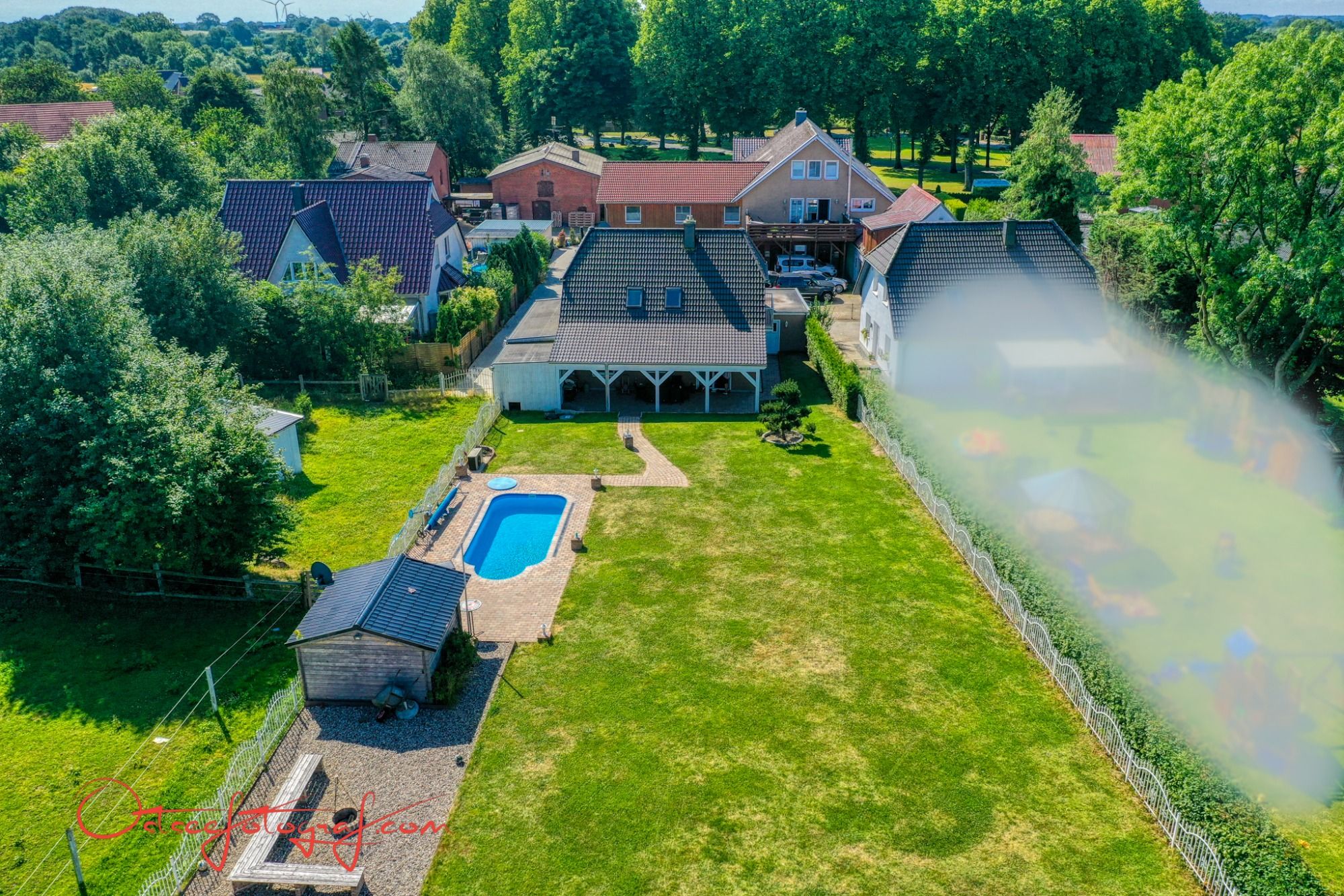 Luftbild von Photoservice.Immo eines kleinstädtischen Hauses mit Umgebung zur Verdeutlichung der Wohnsituation.